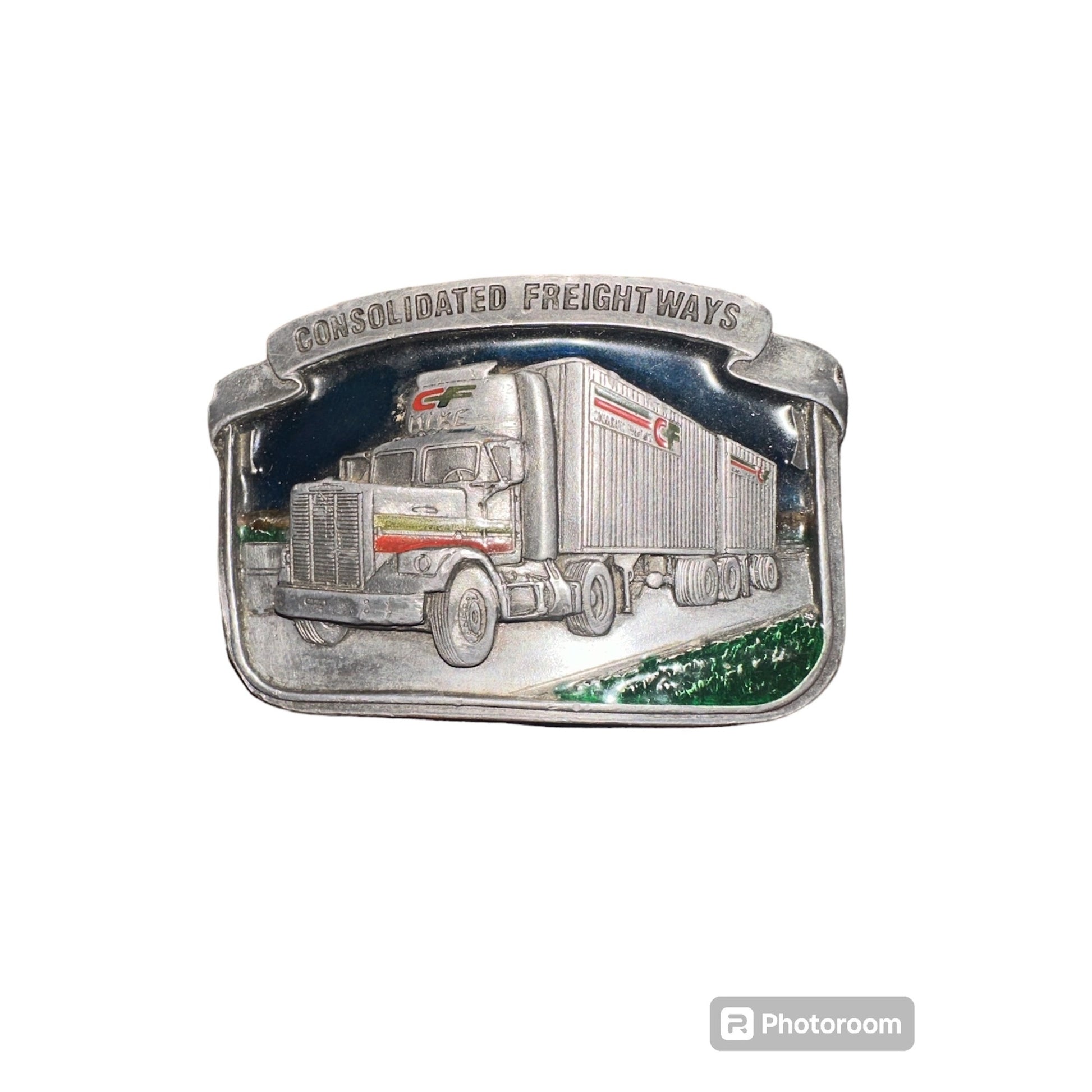 Celebrate the legacy of trucking with this solid metal belt buckle featuring a detailed Consolidated Freight ways truck design.