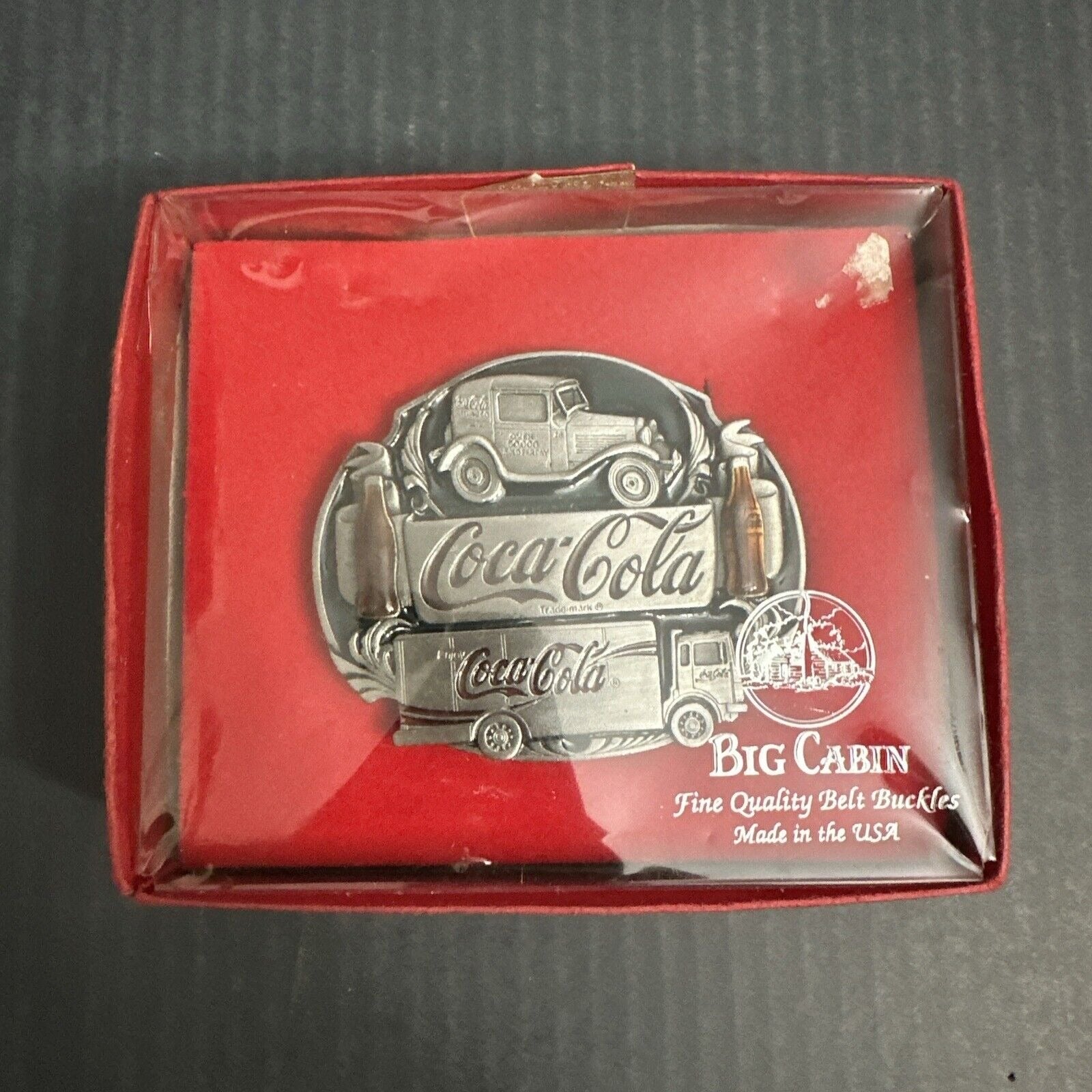 This vintage Big Cabin belt buckle from 1991 features a Coca delivery, truck, and two enamel coca-Cola bottles
