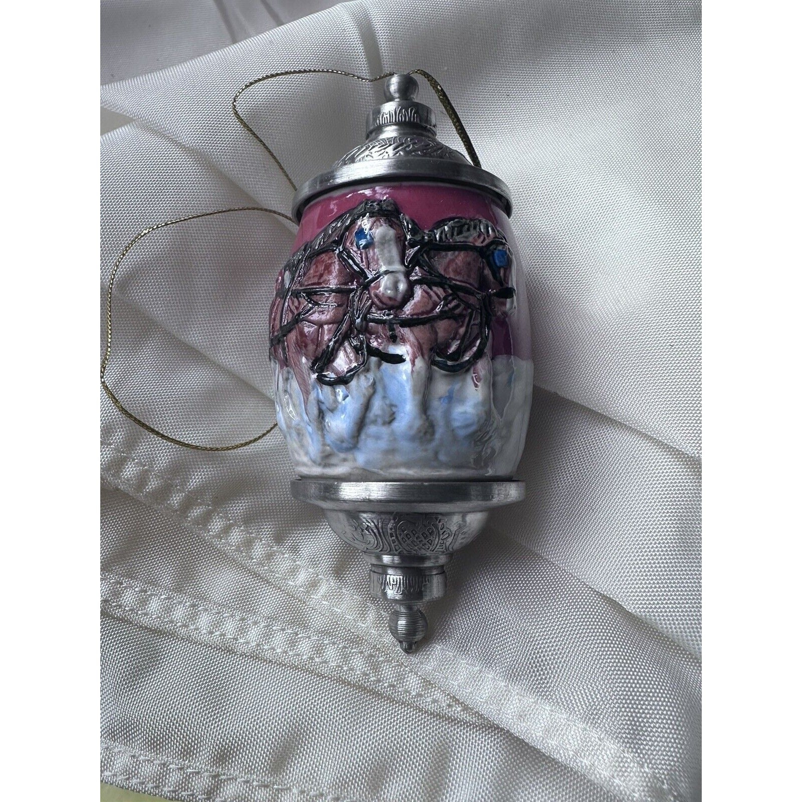 This 2006 holiday collectible Christmas ornament featuring the Budweiser Clydesdales is a must-have for any collector. Crafted from mixed materials, this ornament stands at 3.25 inches tall and comes with a box for safekeeping. It also features a hanging mechanism for easy display.