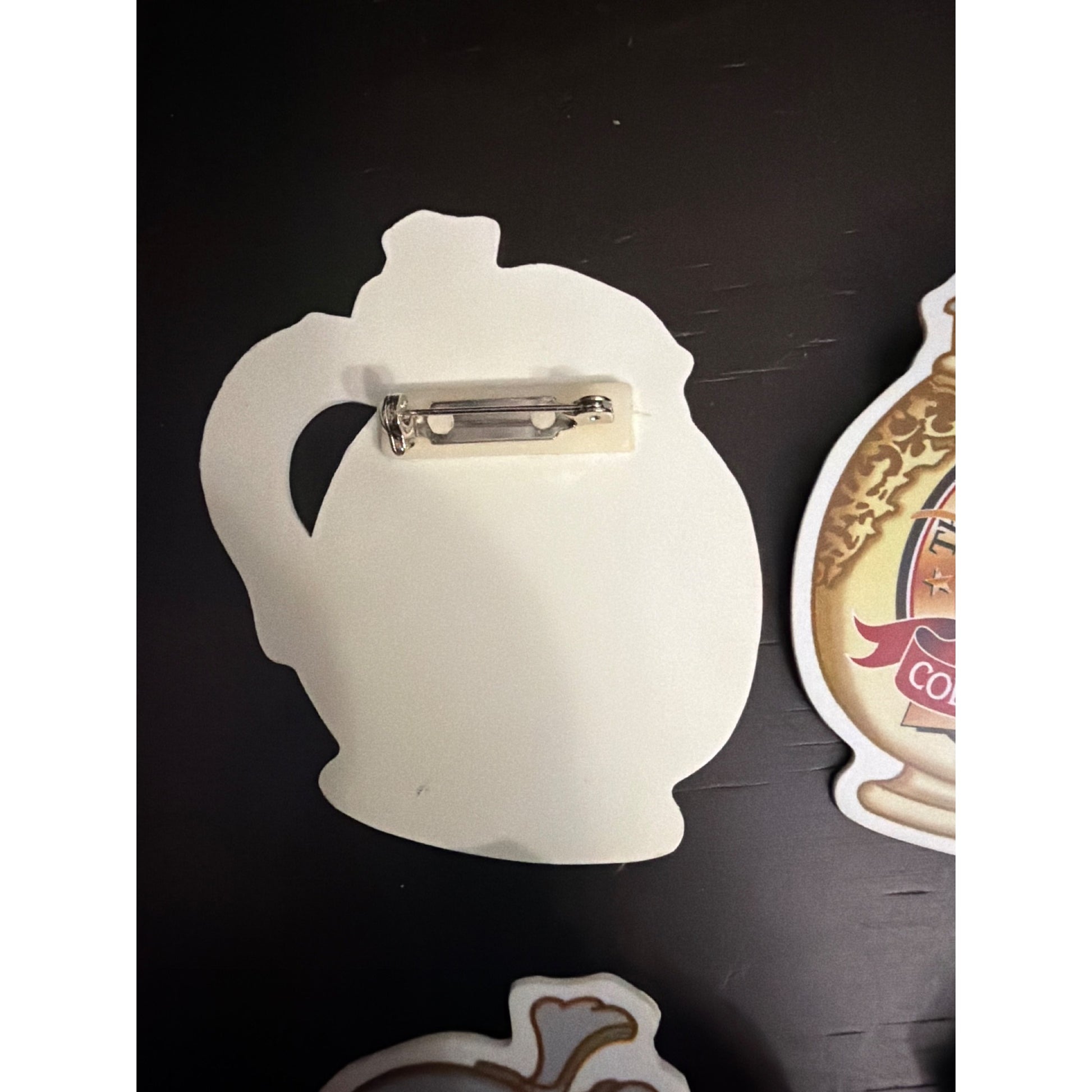 Set of four collectible pinback buttons featuring a stein mug design with intricate details and secure pin closures.