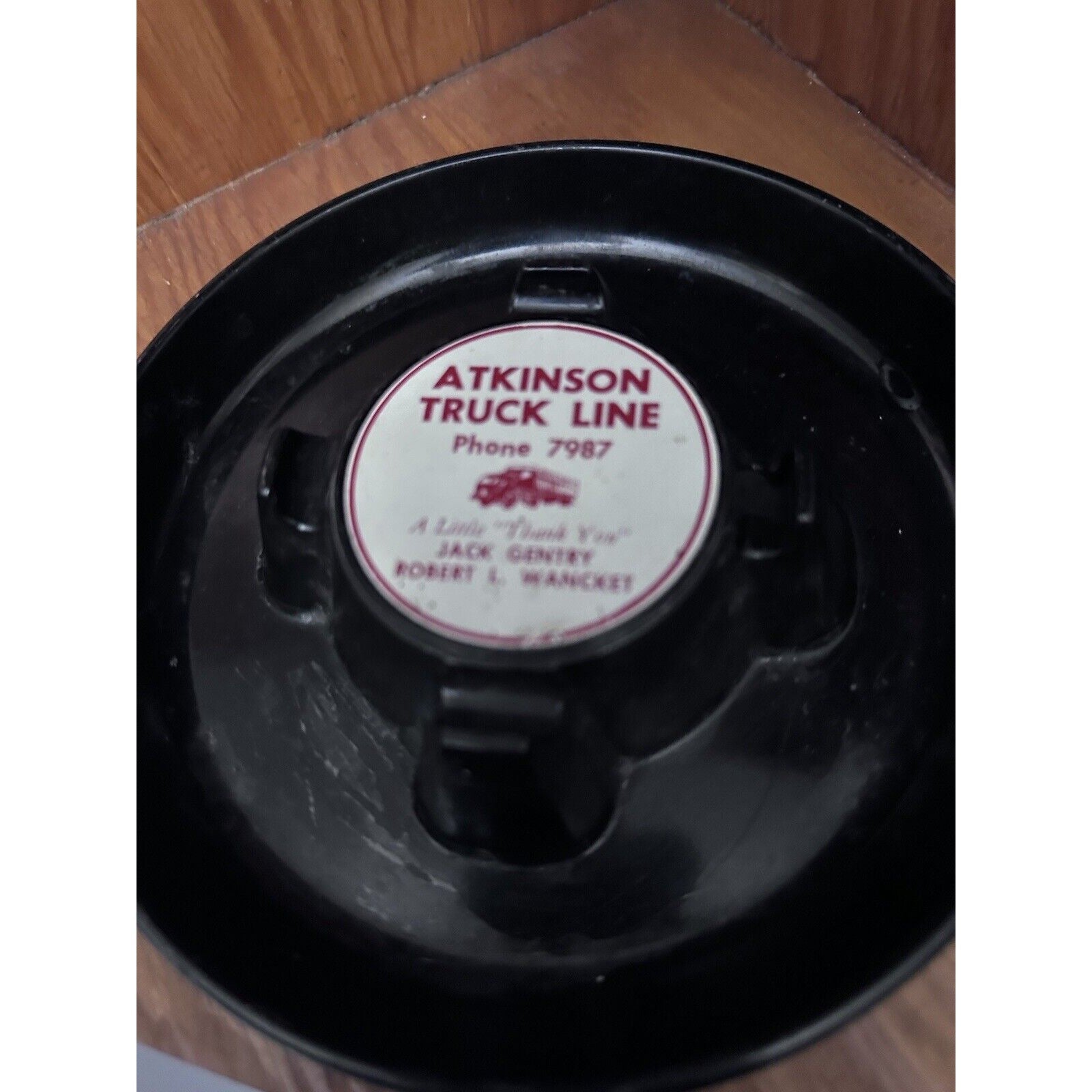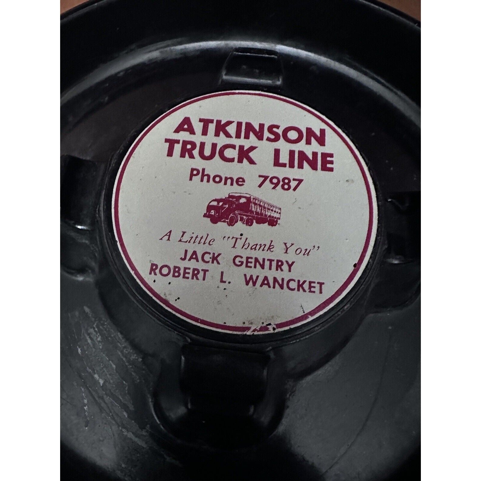 This vintage ashtray from Atkinson Truck Line , this ashtray has a large round shape with a sleek black finish. Its design is perfect for any ashtray collector or truck enthusiast looking to add a unique piece to their collection.