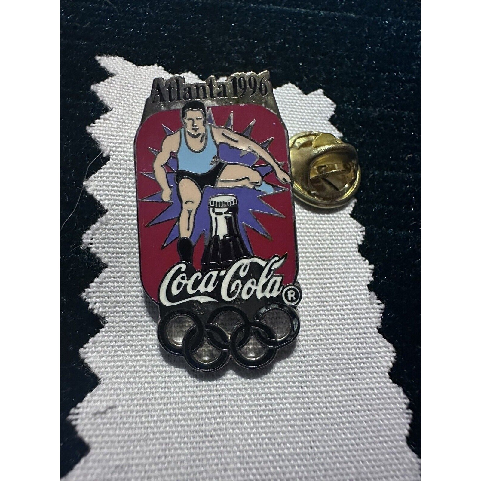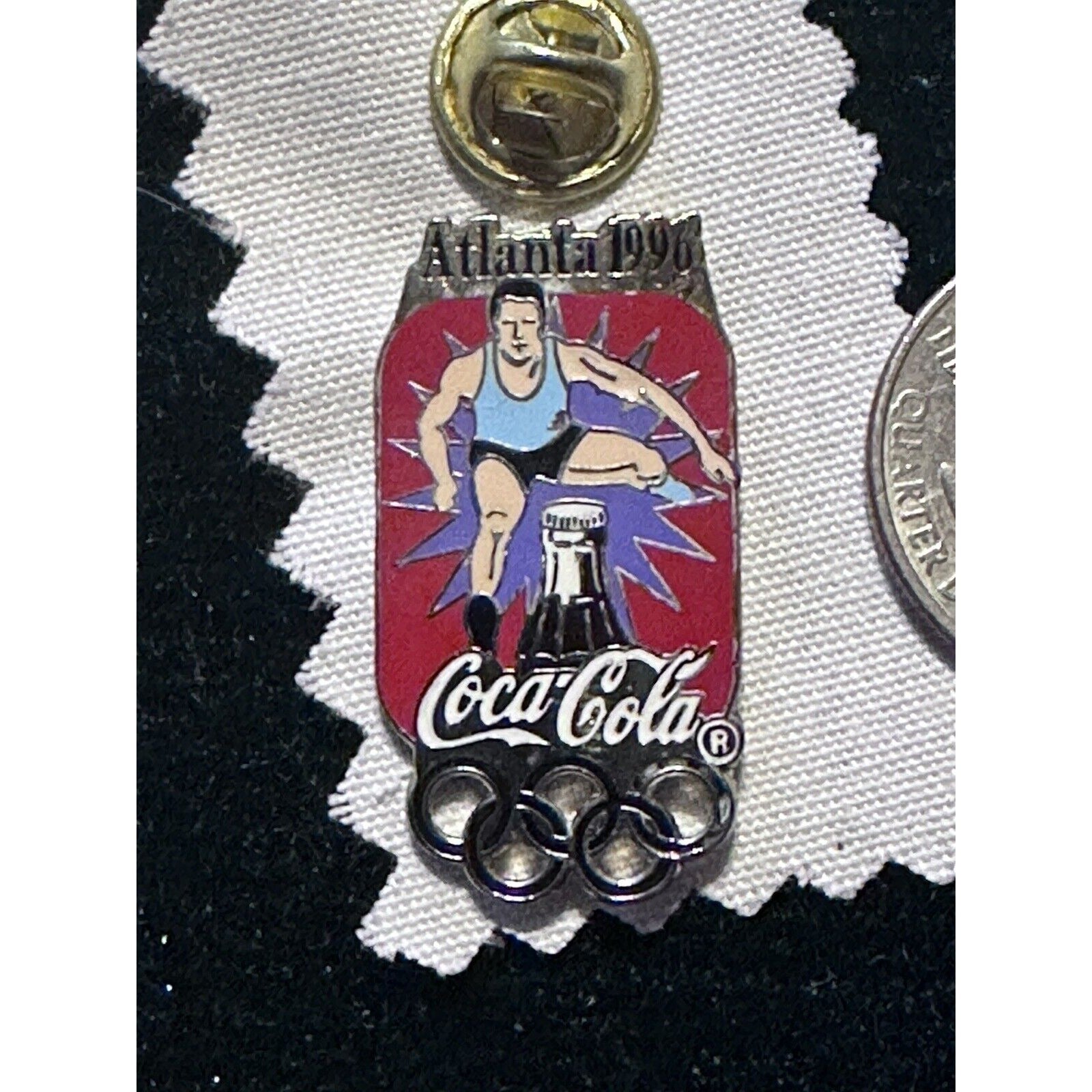 This Coca-Cola bottle and hurdles Olympic pin track from the 1996 Atlanta Olympics is a rare find for any sports memorabilia collector. The pin features the iconic Coca-Cola logo and the event name, making it a unique addition to any collection. The pin is also a great addition, featuring the official Olympic logo and colors.