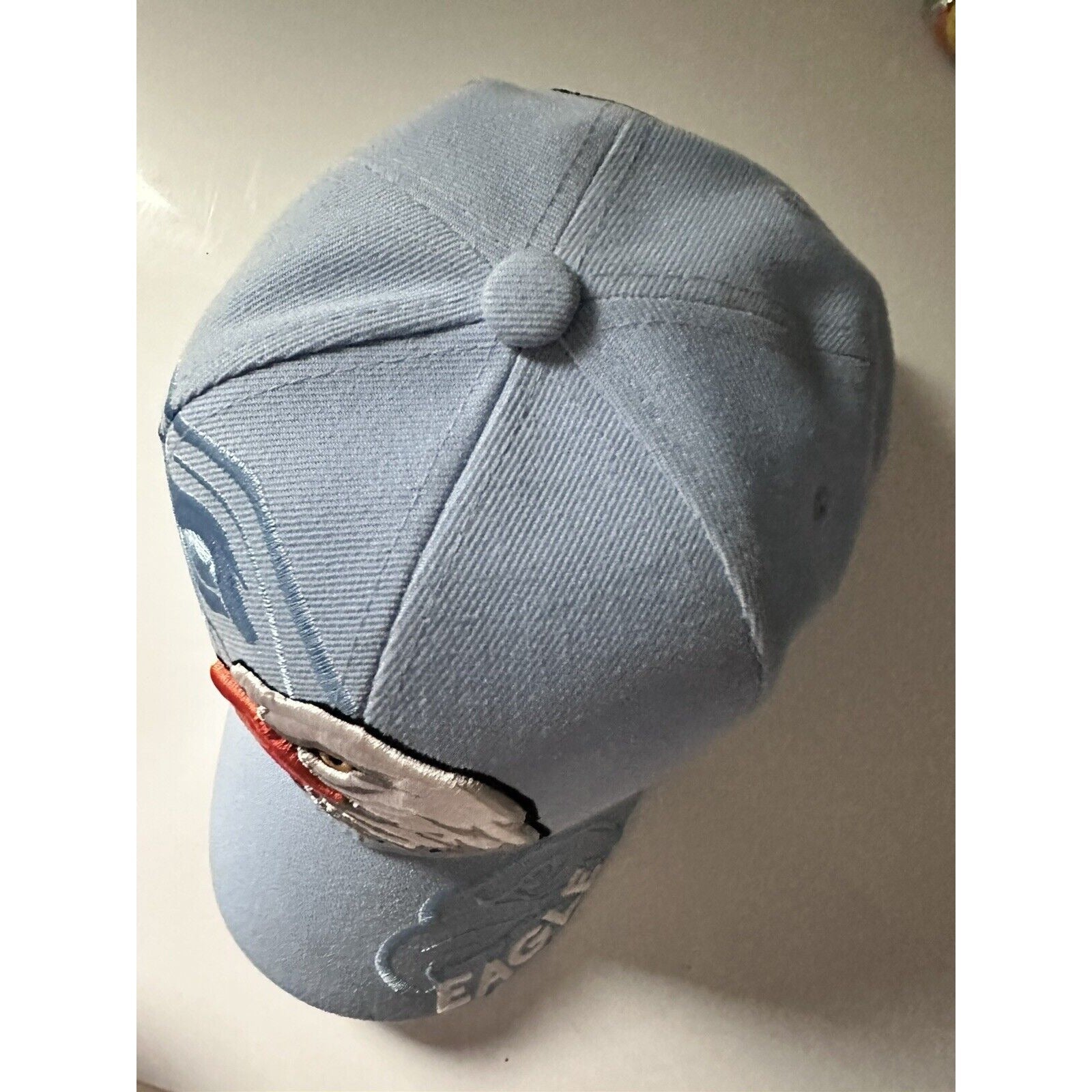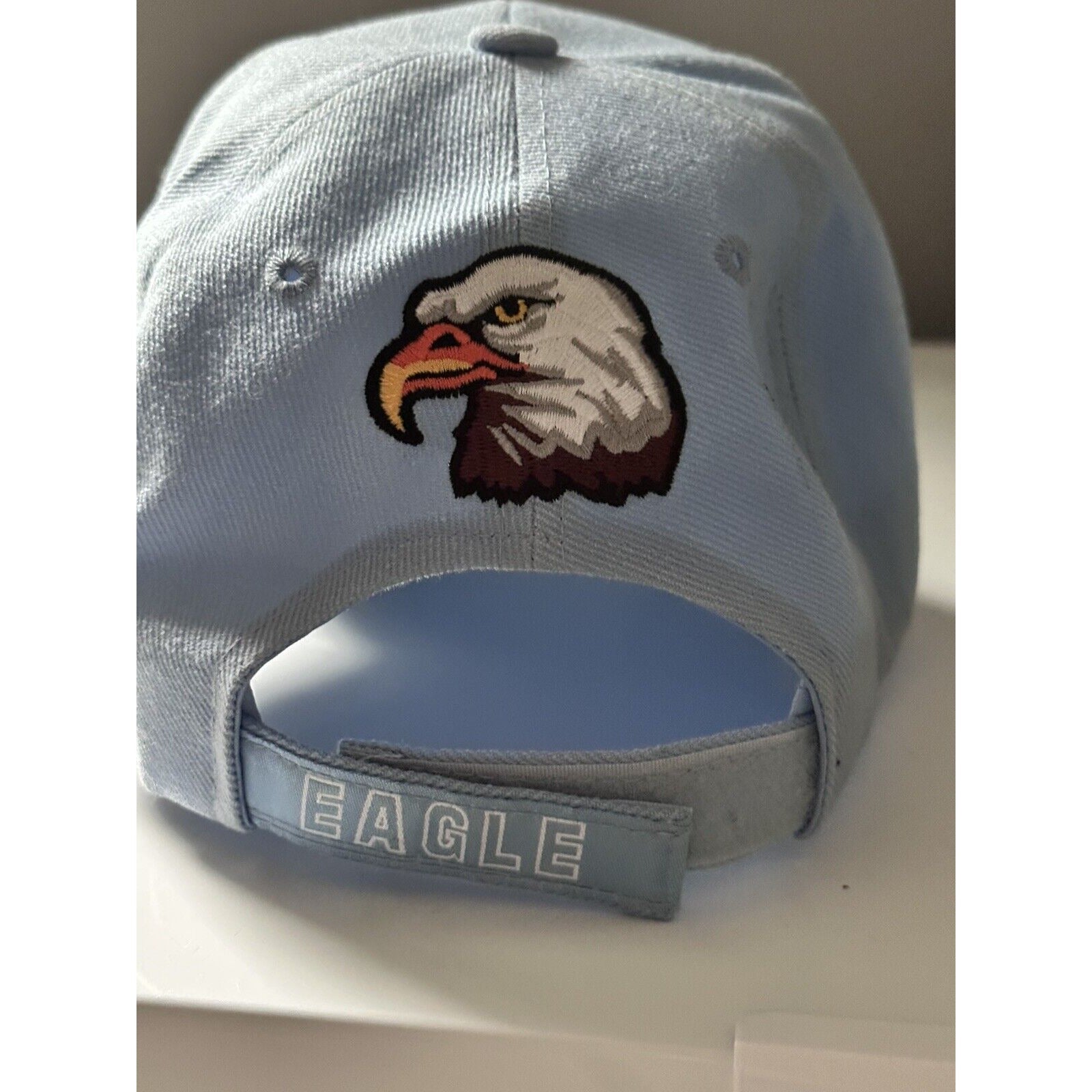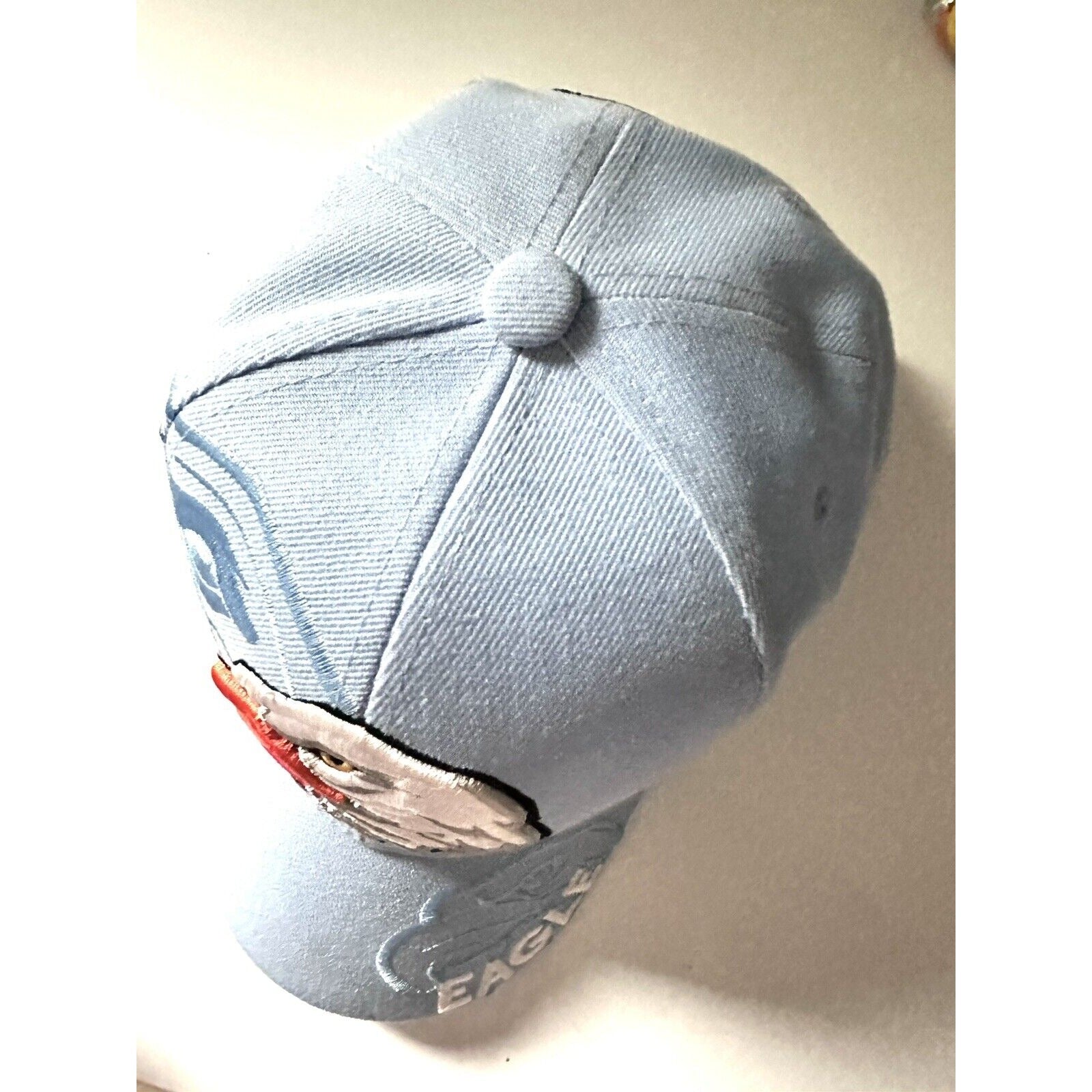 Bald Eagle Thick Embroidered Design Baseball Light Blue Hat Curved Brim. Hook loop closure. Shadow. Lots of detail and embroidery on the hat
