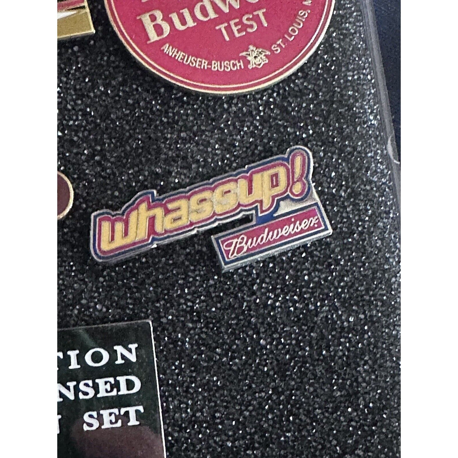 set includes 6 unique pins, each showcasing different designs of the iconic Budweiser logo and imagery. The pins come in a sleek case for easy display and safe storage.