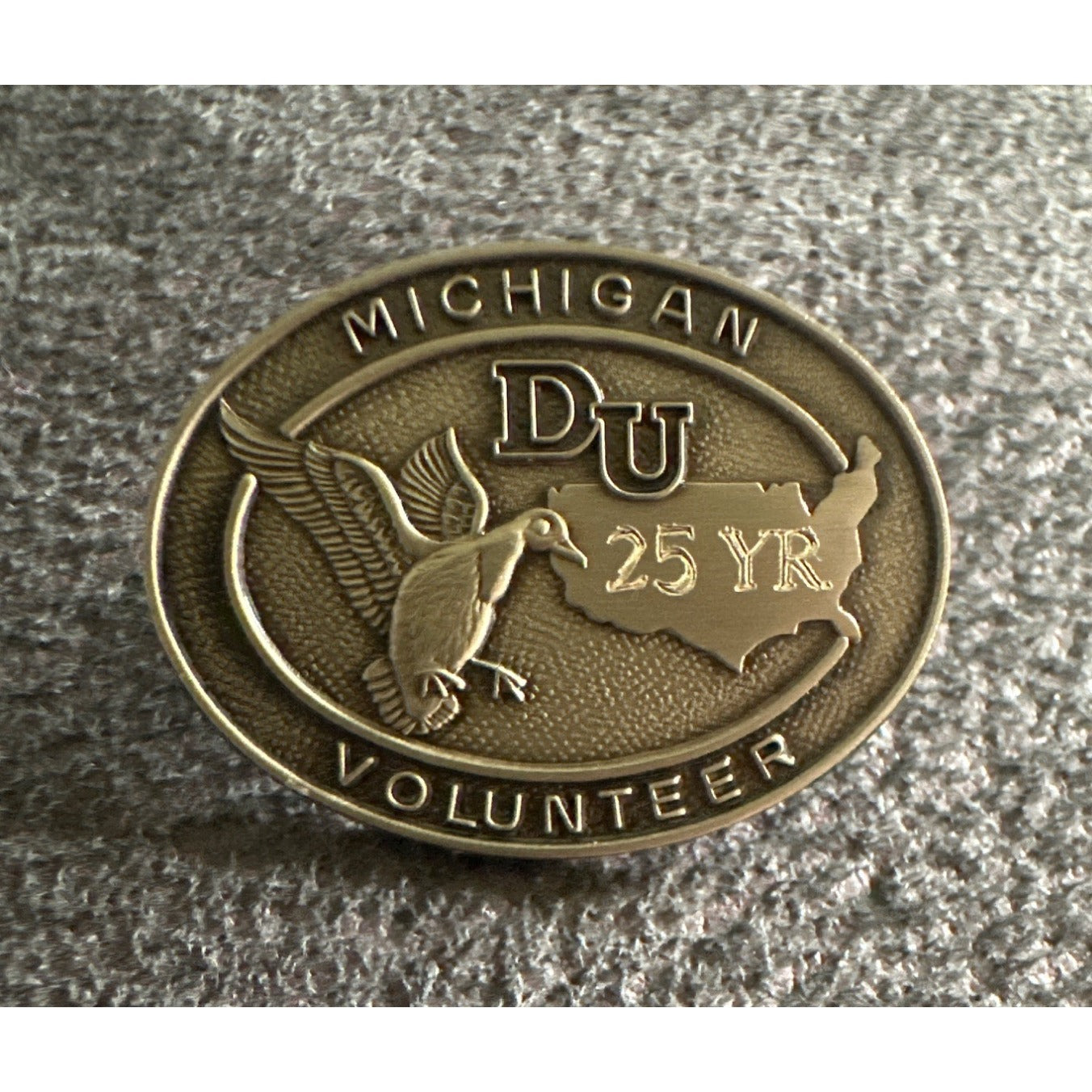 This Ducks Unlimited pin celebrates 25 years of volunteer service in Michigan. it's a meaningful piece for collectors.