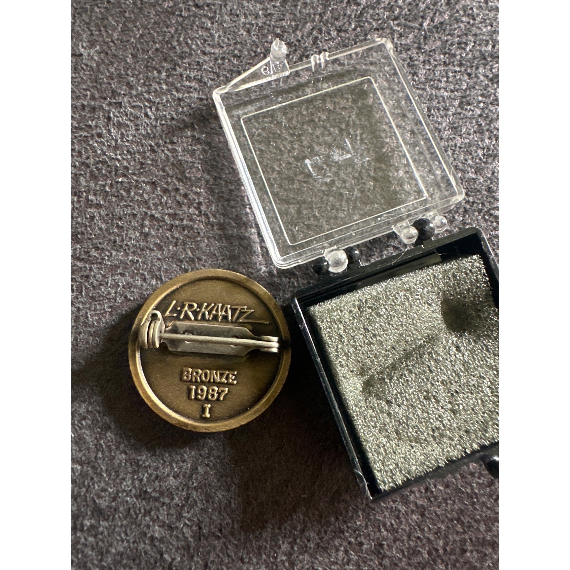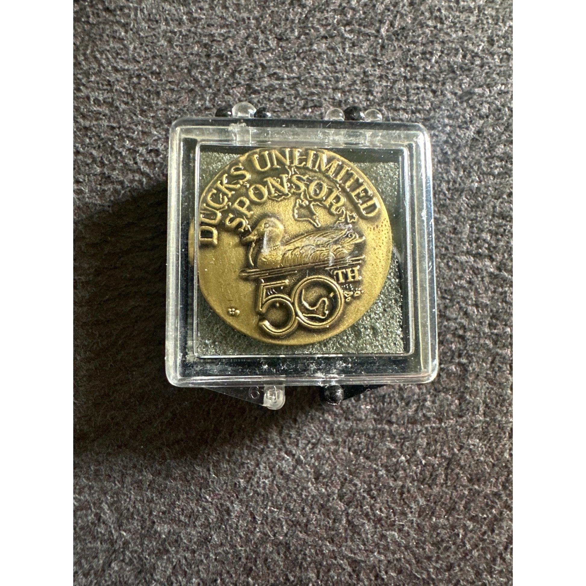 Celebrate 50 years of Ducks Unlimited with this commemorative bronze pin. Crafted in 1987 by L.R. Kaatz, it features a detailed duck design.