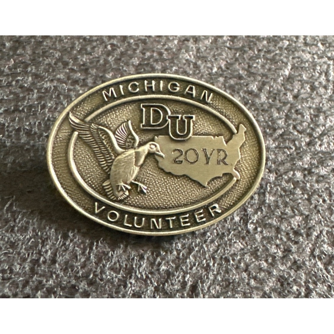 This Ducks Unlimited pin commemorates 20 years of volunteer service in Michigan. It's a collector's item symbolizing dedication to wildlife conservation.