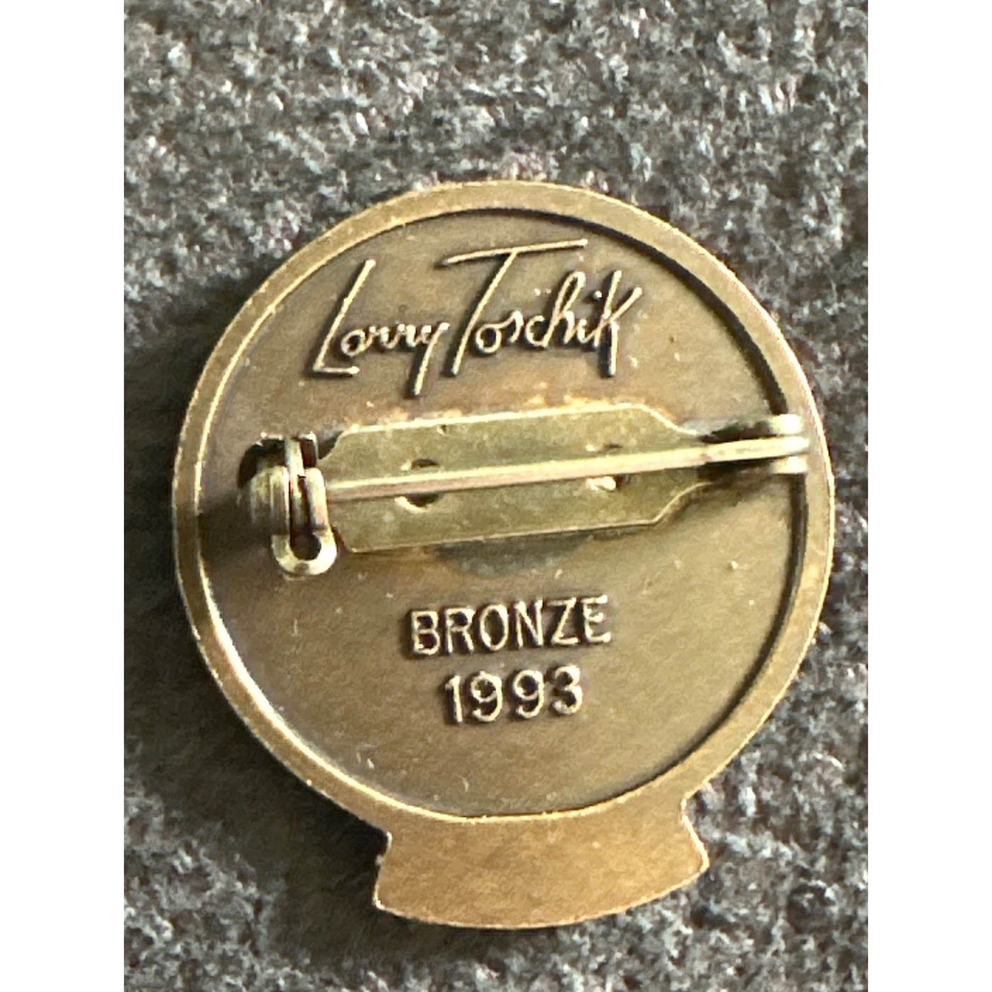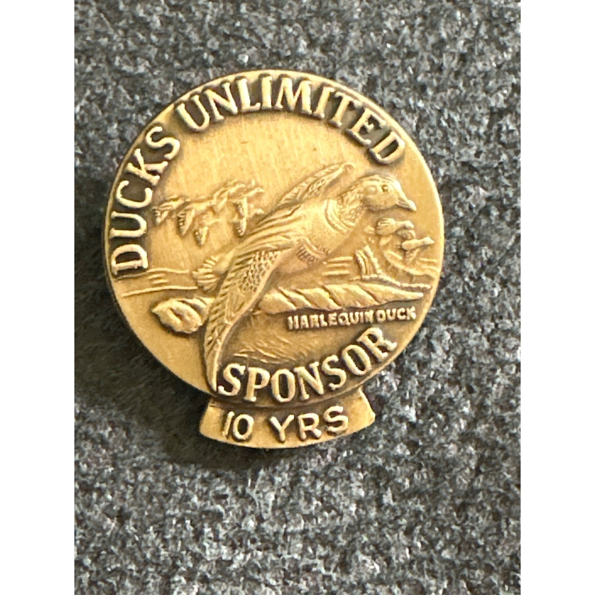 The Ducks Unlimited Sponsor pin commemorates 10 years of dedication. Crafted in 1993 by Larry Toschik, this bronze pin is a collectible piece for enthusiasts.