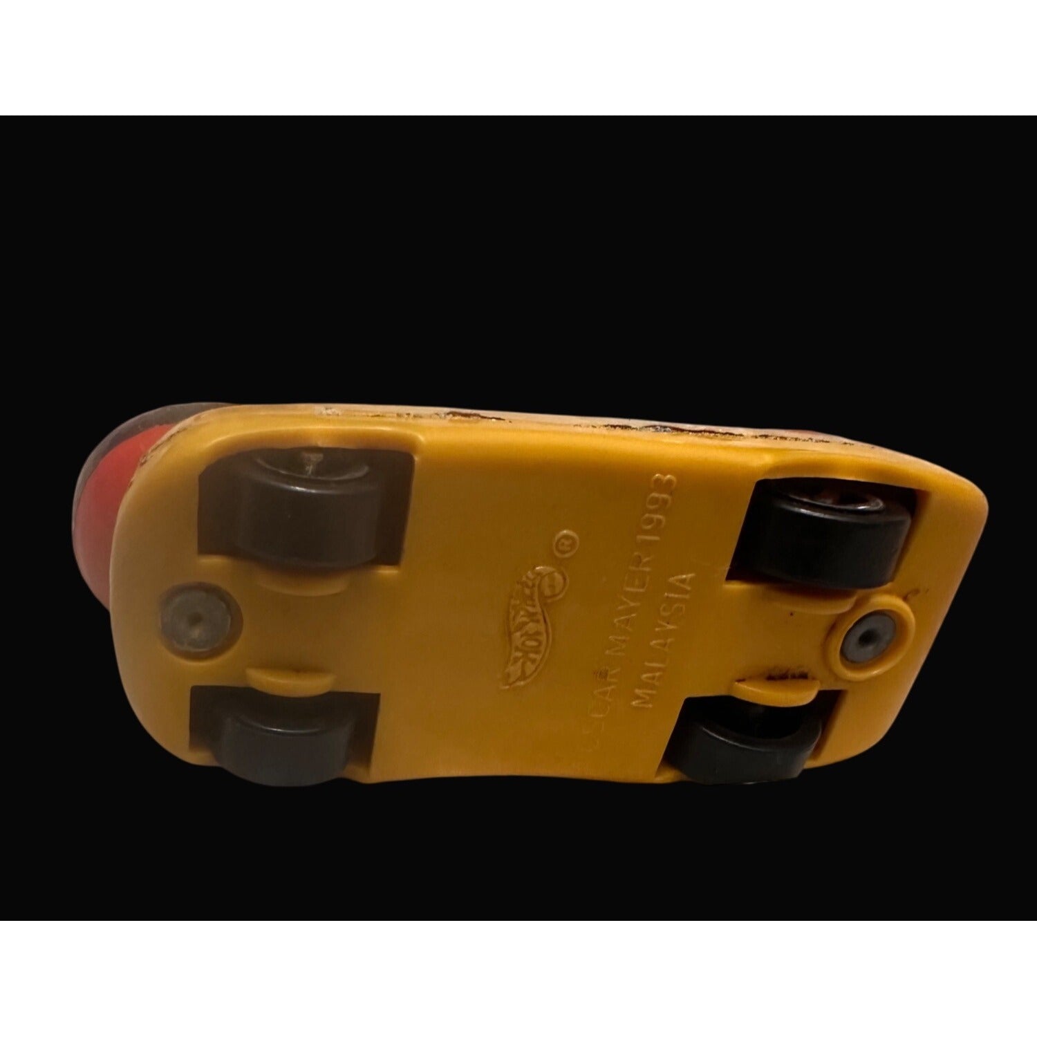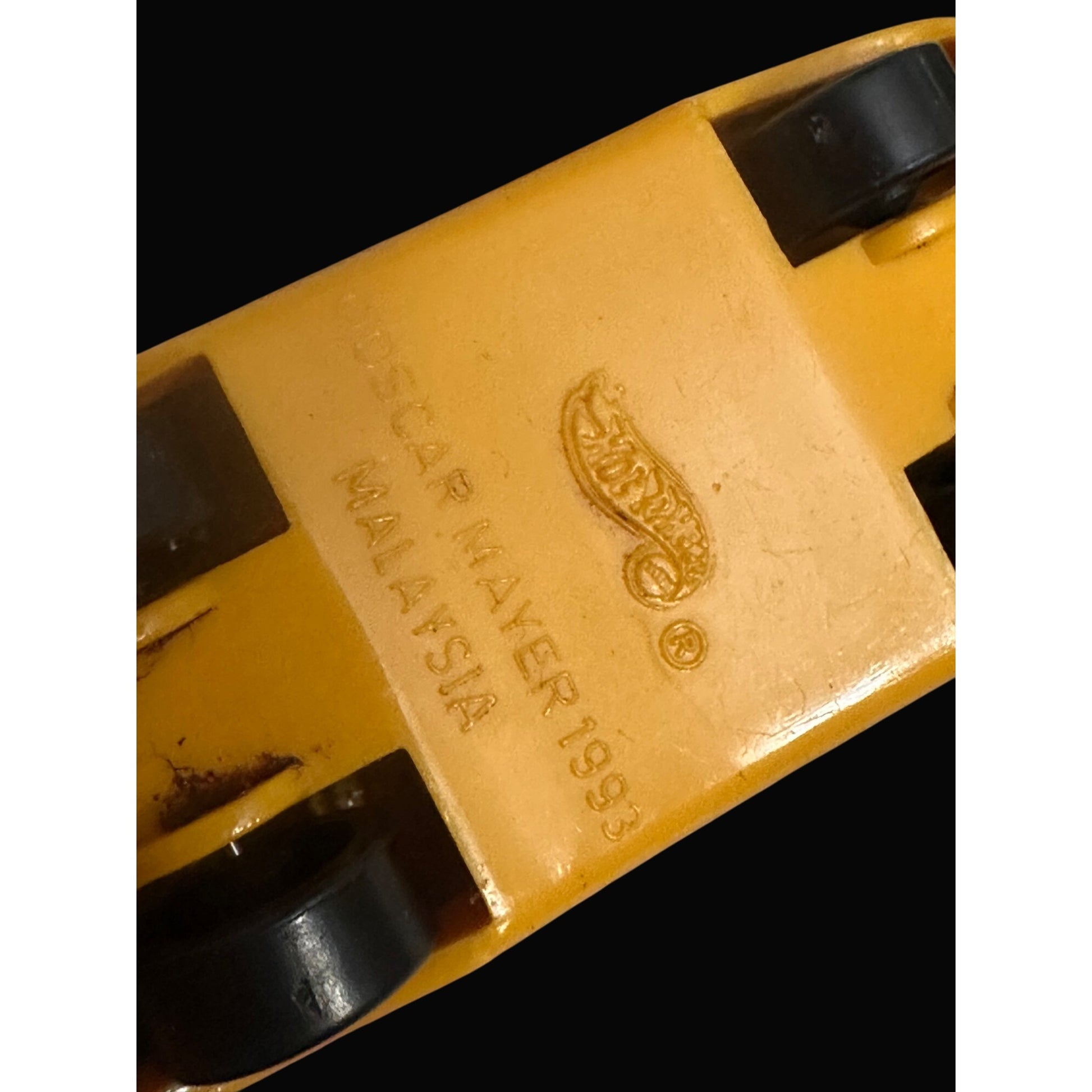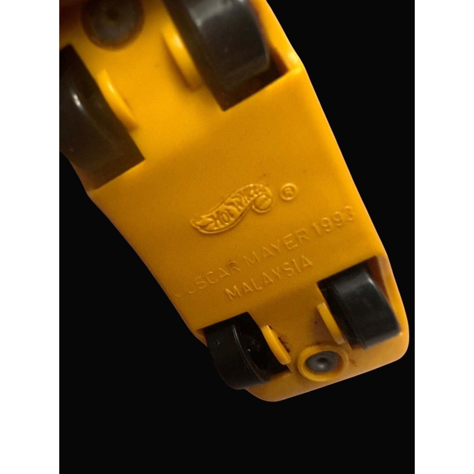 A 1993 collectible Hot Wheels Oscar Mayer Wienermobile diecast car, showcasing a playful hot dog design. Ideal for collectors or nostalgic enthusiasts.