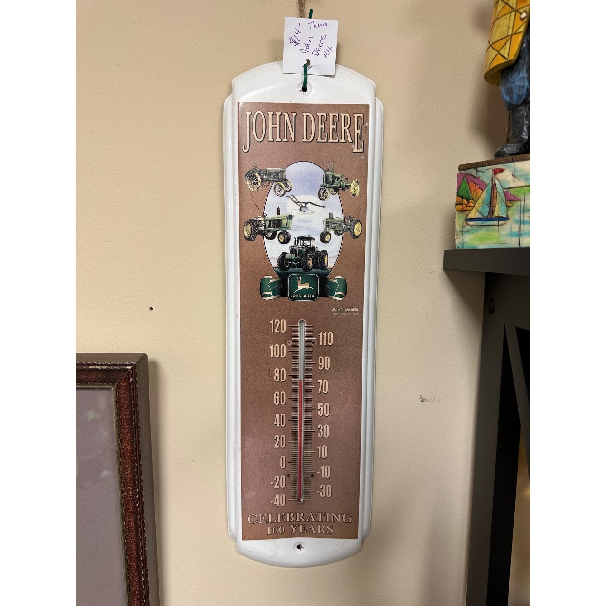 A curated selection of John Deere-themed collectibles, perfect for enthusiasts. Includes mugs, a tin box, keepsake ornaments, a tumbler, a bear figurine, and a tractor model.