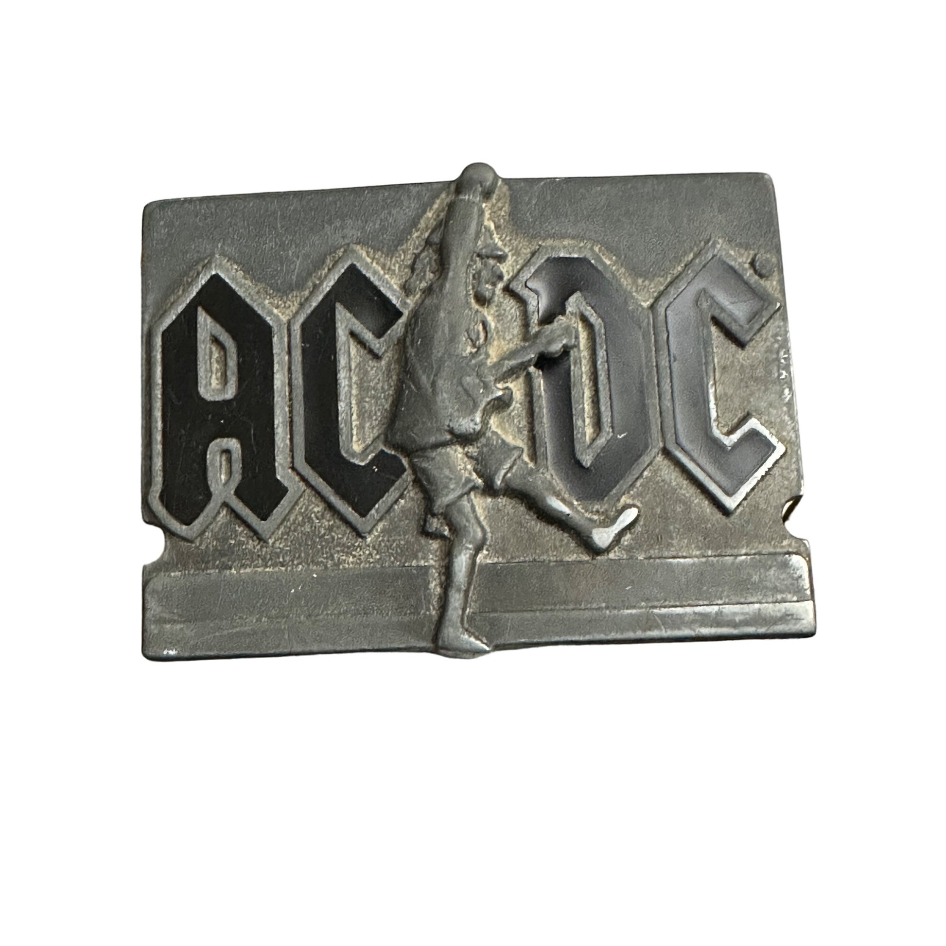 Iconic AC/DC belt buckle featuring the band's logo, crafted from durable metal with a genuine leather strap. Ideal for rock music enthusiasts and collectors.