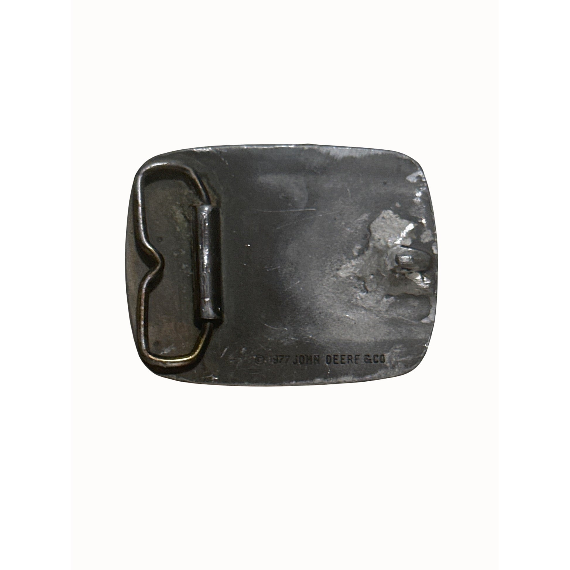 This belt buckle features a detailed tractor design, celebrating John Deere's agricultural heritage. A vintage piece from 1977, it's a collector's item.