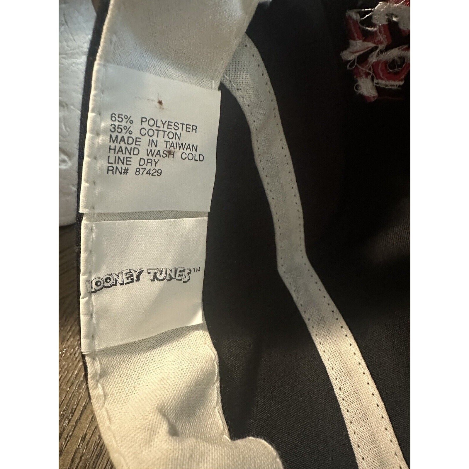 The hat features a colorful design of Bugs Bunny as Santa Claus, embroidered looney tunes on back red white candy cane stripe