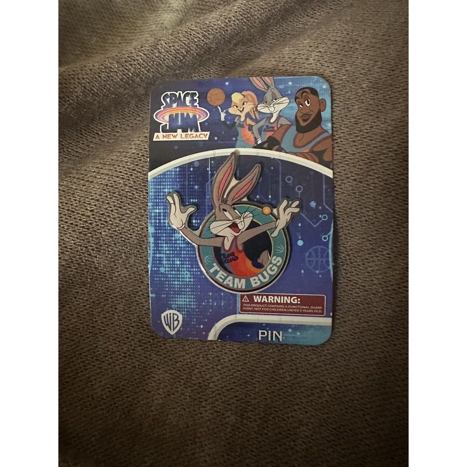 This product is a new enamel pin featuring Bugs Bunny from the Looney Tunes franchise. The pin is part of the Warner Bros Studio Tour and is themed around the movie Space Jam. The pin is designed with the phrase "Team Bugs" and is manufactured in 2022.